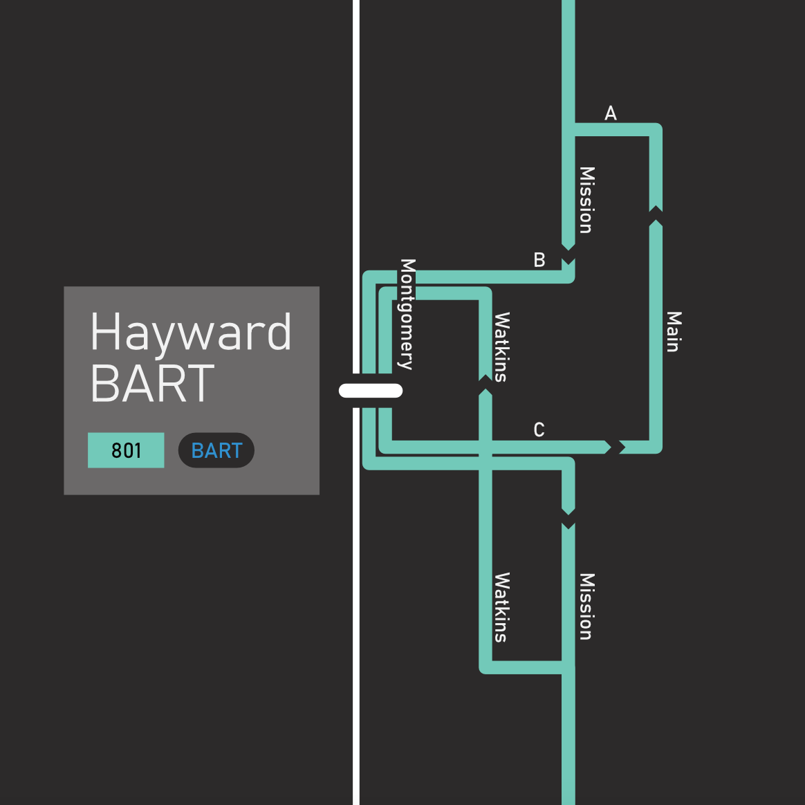 Downtown Hayward is a mess of one way streets and bus service reflects that. AC Transit does an awful job at telling you which way the bus goes. Yes, its decipherable through looking on maps for a while, but god is that frustrating. I think I’ve made something pretty good to tell you where 801 goes in downtown Hayward.