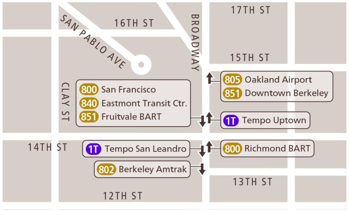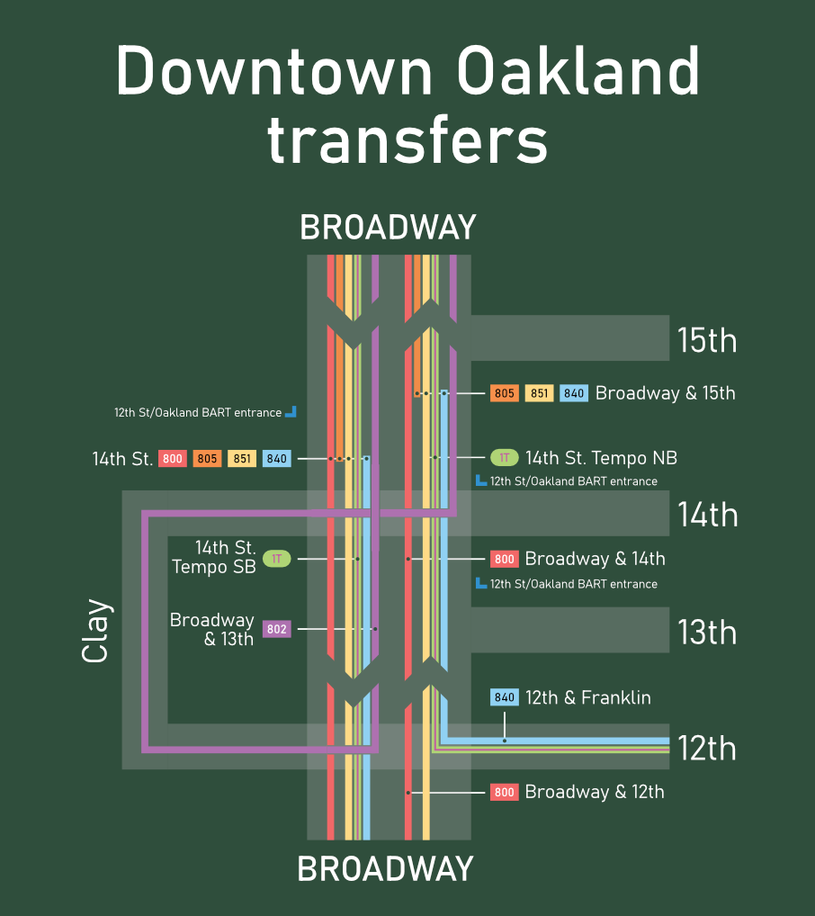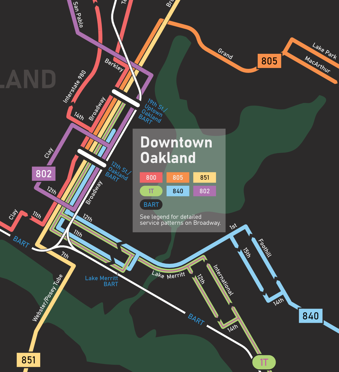 I came into this project with three main goals: first, to clearly differentiate between all seven lines on the network, two, to display the routing in downtown Oakland in a clear way, and three, to have a good, clear transfer diagram (the current one, from actransit.org, is shown below)