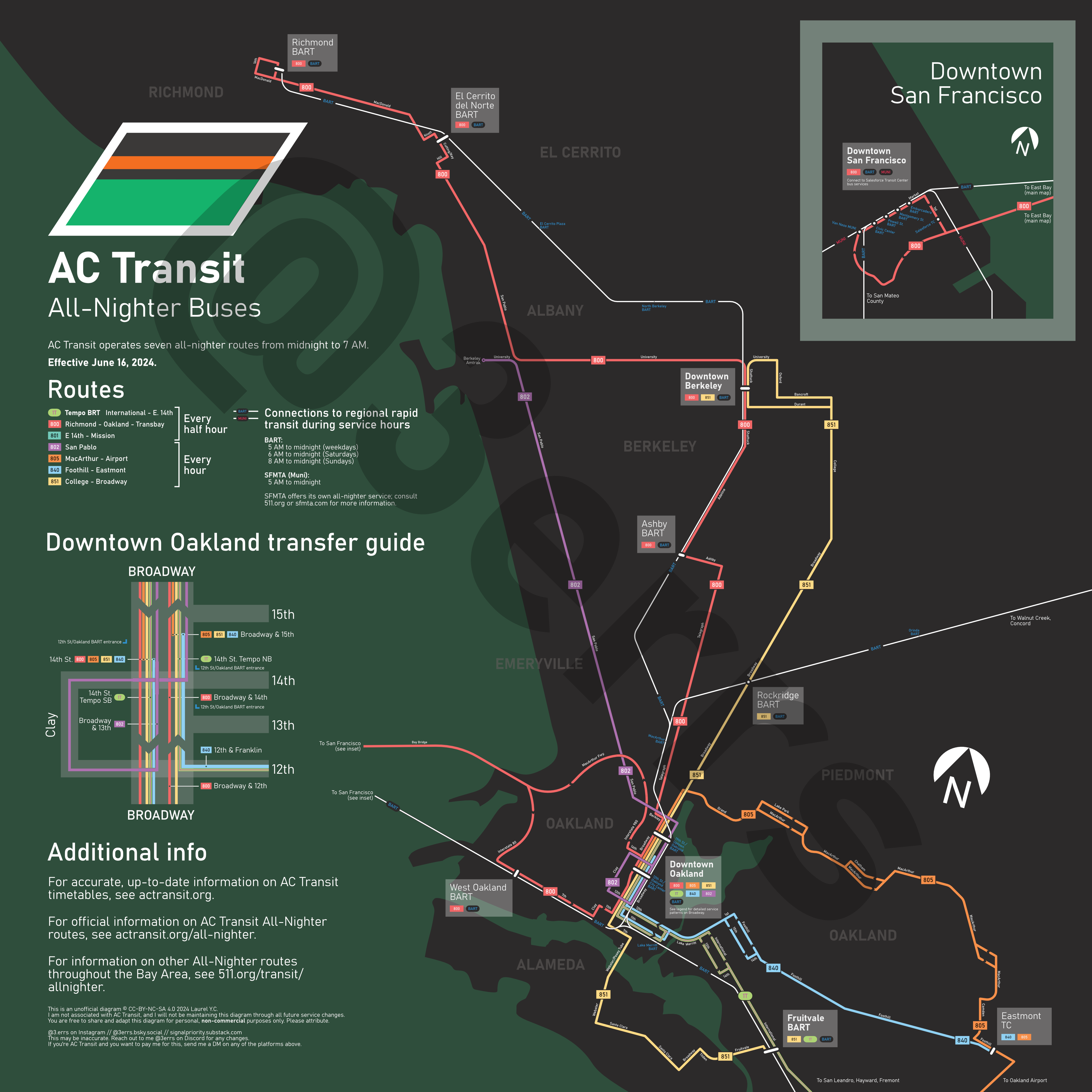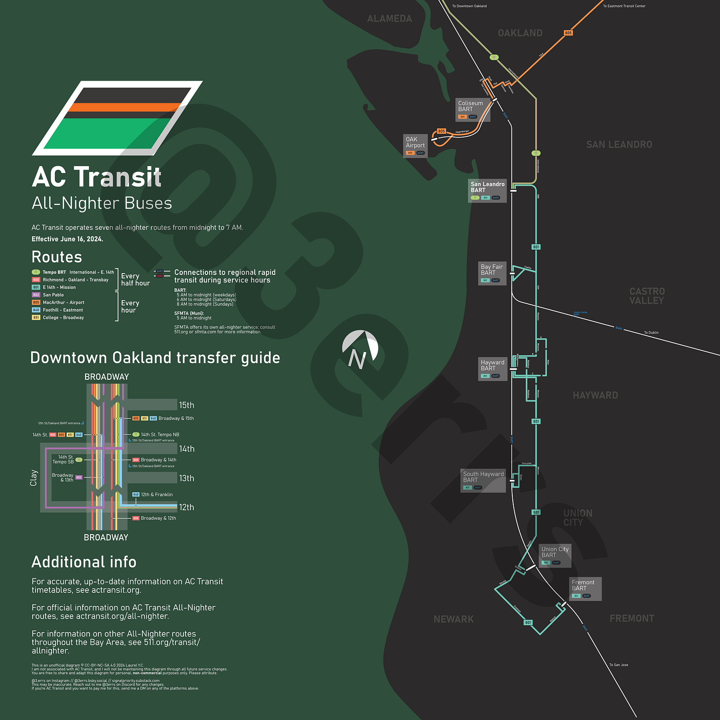 What you see above are AC Transit’s night bus routes north and south of Fruitvale. I figured this was a good place to cut the map, which was originally actually one poster, as it’s a relatively central station on the network. AC Transit operates seven overnight routes; you can find more information on that here, and more information on the rest of the Bay Area’s overnight transit network here.